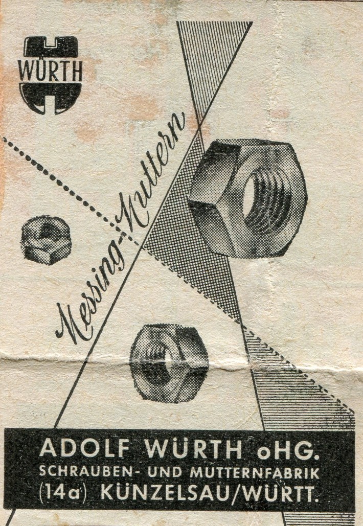 Adolf Würth, padre di Reinhold Würth, fonda un'azienda di vendita all'ingrosso di viti e dadi a Künzelsau, in Germania. L'azienda Würth ebbe la sua prima sede nel complesso di edifici Schlossmühle a Künzelsau.
